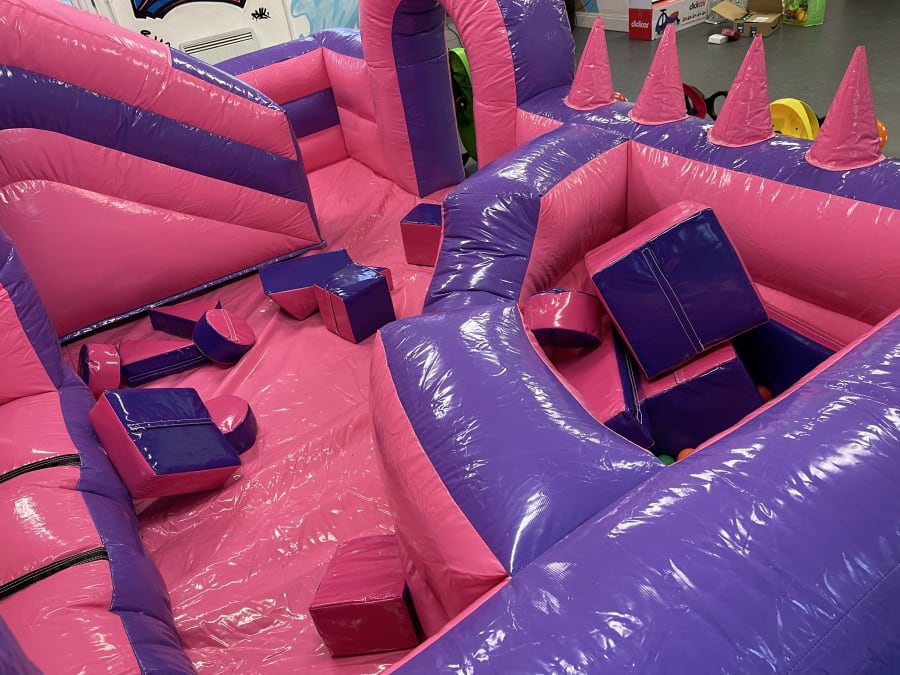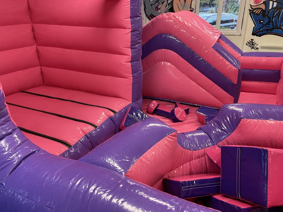 That's correct, you read it right the ultimate of party packages! So not only do you get a slide, a bouncy castle, air jugglers and an epic ball pool but you also get 18 pieces of pink and purple glossy soft play that matches the play park perfectly!
