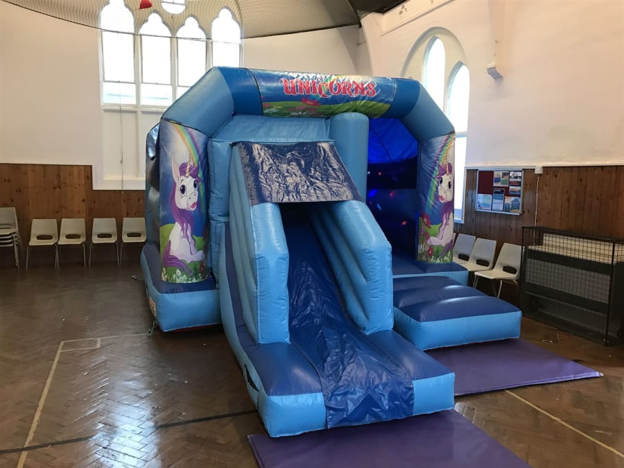 We are very proud to present our Unicorn Disco Slide Castle available to hire in all of our delivery areas .