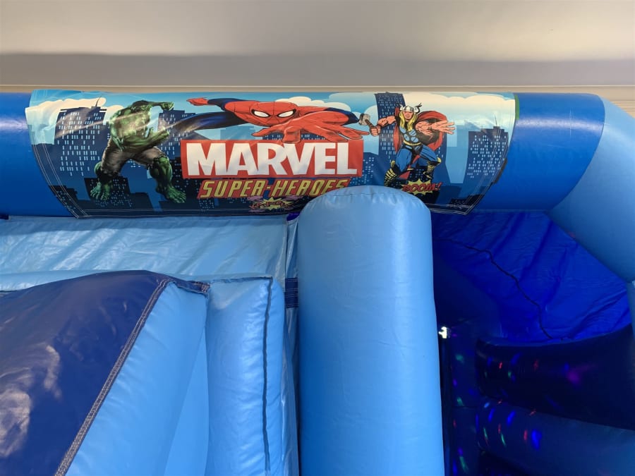 Slide into action on our Superhero's themed Disco Slide and Bounce Castle.