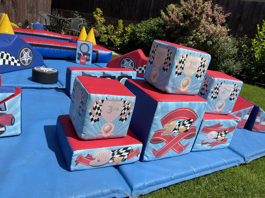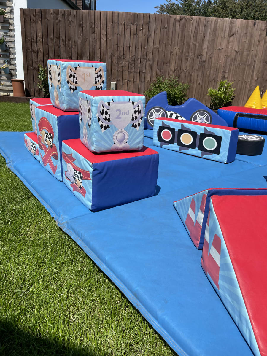 This package is amazing. 20 Pieces of racing soft play including two sit on cars and a real podium. A ball pool with air jugglers is also included for that extra bit of fun! Let the little ones crash around on the safety mats and change the tyres on a racing car all within the safety of soft play!