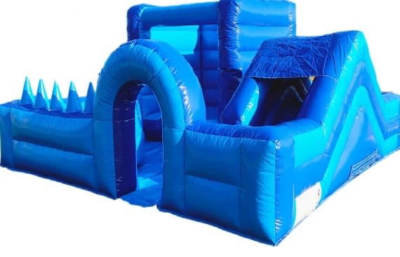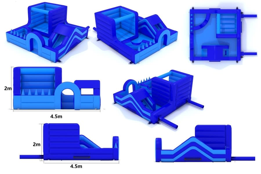 Did you want a bouncy castle, ball pool and slide all contained in one safe inflatable compound? If the answer is yes then look no further. This inflatable has a covered slide, large ball pool and small bouncy castle including air jugglers! Its a safe amazing bit of kit finished in glossy blue and dark blue colours. With a perimeter wall surrounding the outlines of the park you can see in to the inflatable to make sure the kids are safe but at the same time they cant escape without coming out through the arch.