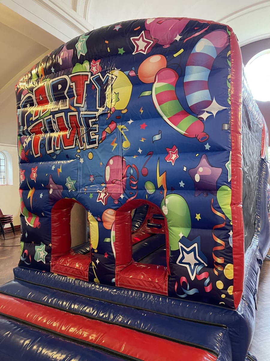 Our 30' disco fun run is an amazing bit of kit. Not only is it suitable for kids and adults, not only can it go indoors and outdoors and its generic Party Time theme means its suitable for any occasion BUT it also has a bluetooth speaker and disco light built in. You can play your favourite tunes whilst fighting your way through the bouncy area, up the climbing wall and down the slide. Its great fun and suitable for everyone.