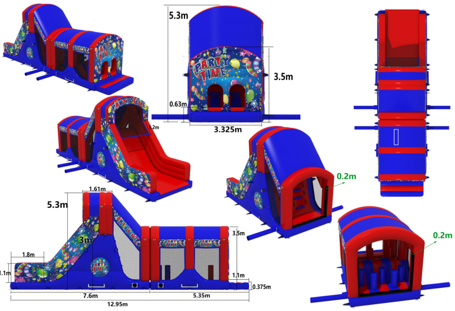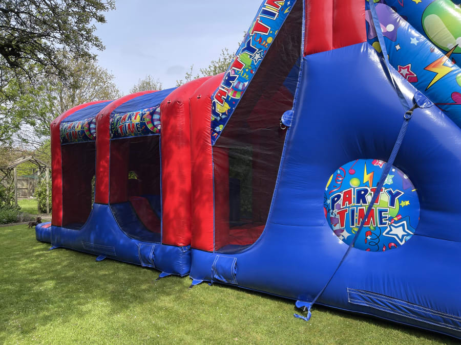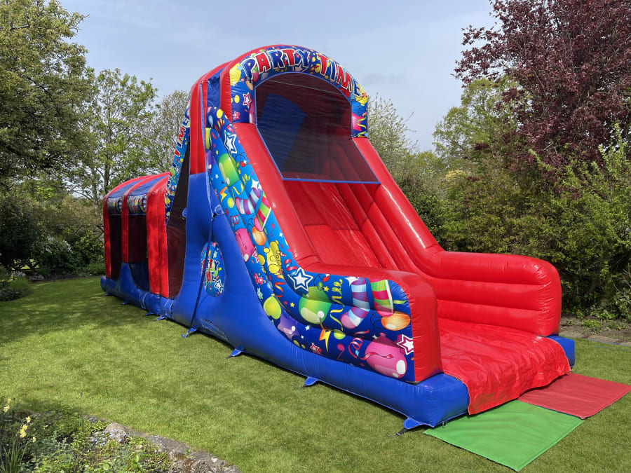 This show stopper is definitely the one for the adrenaline junky. The inflatable has two sections which join together, the first section has biff bash and a hurdle to battle against. There are then more biff bash before climbing up to the 10' high platform slide. Its a dare devil that will throw themselves down to the soft landing area.