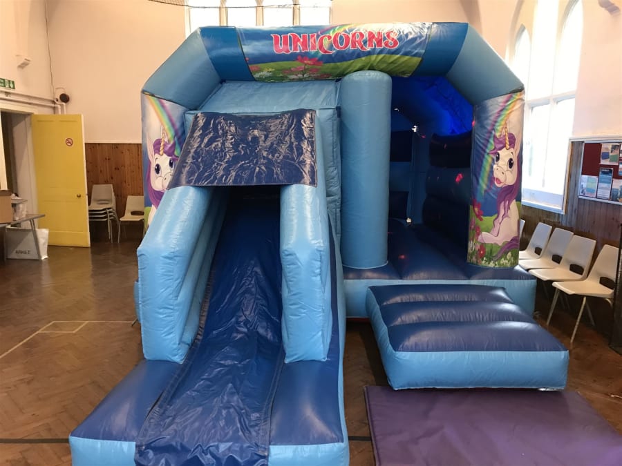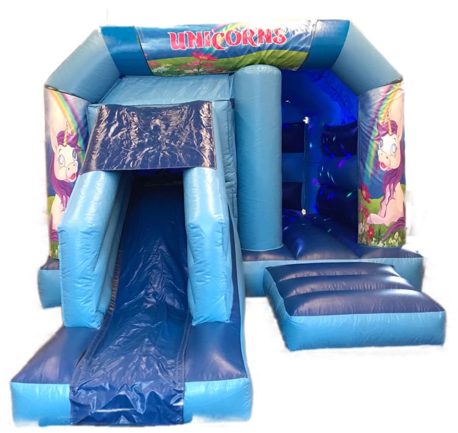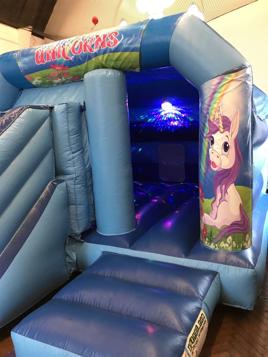We are very proud to present our Unicorn Disco Slide Castle available to hire in all of our delivery areas .