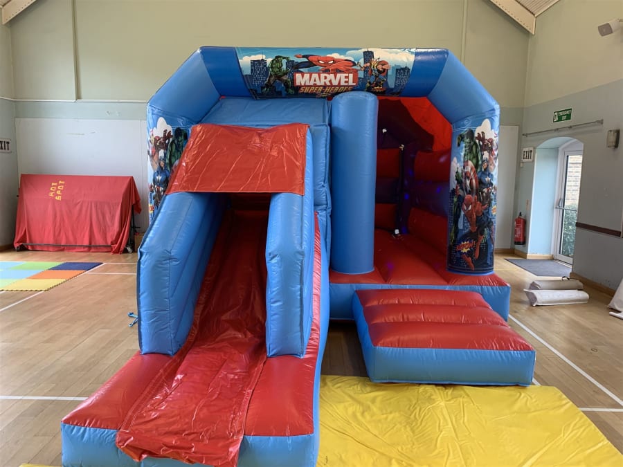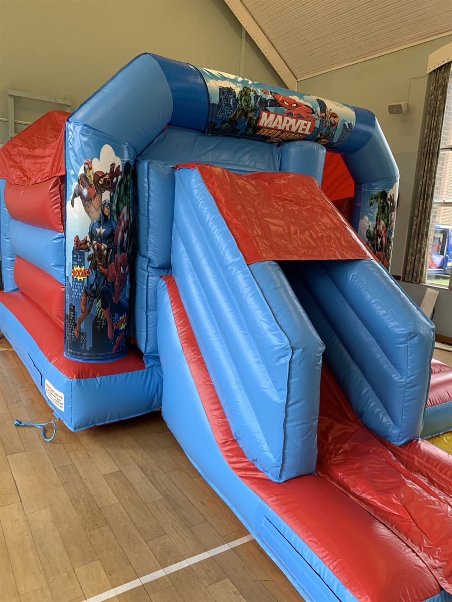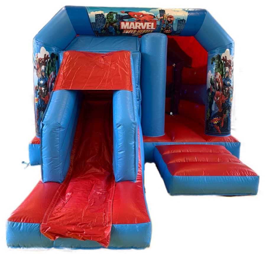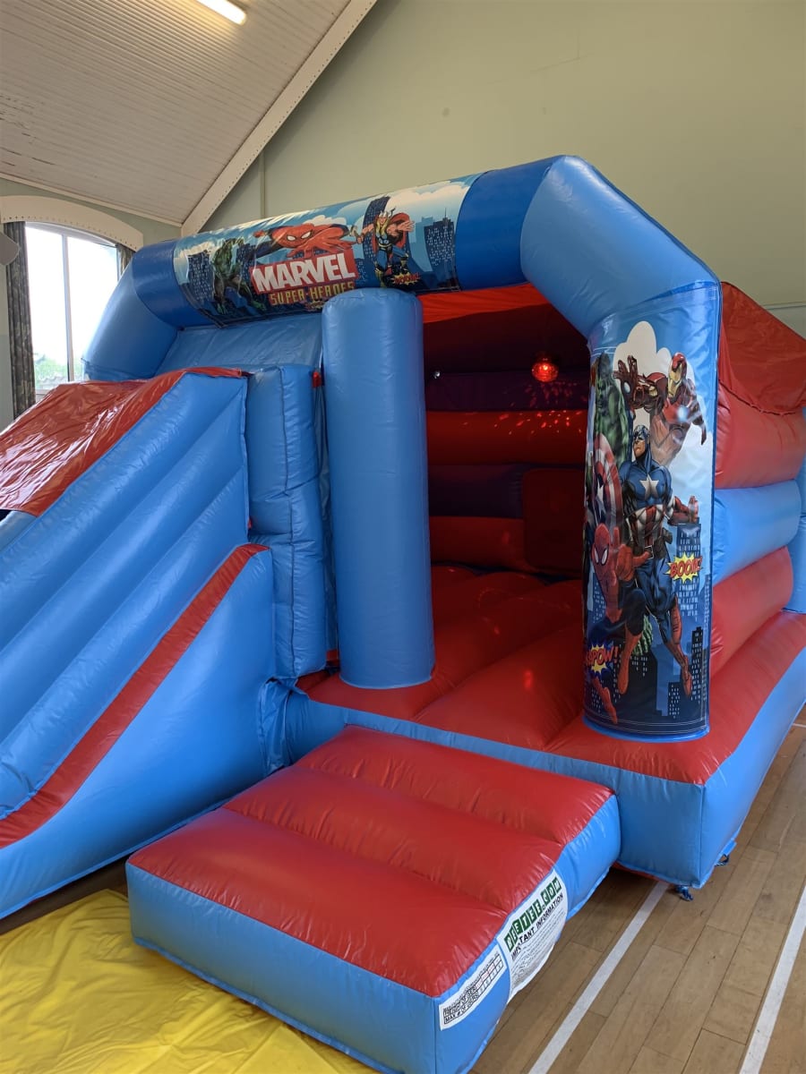 Slide into action on our Superhero's themed Disco Slide and Bounce Castle.