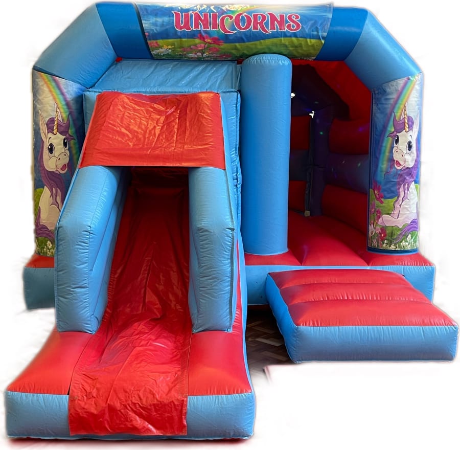 We are very proud to present our Unicorn Disco Slide Castle available to hire in all of our delivery areas .