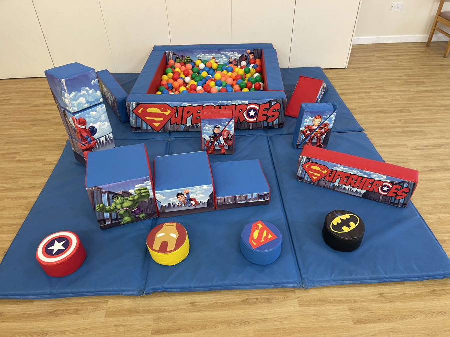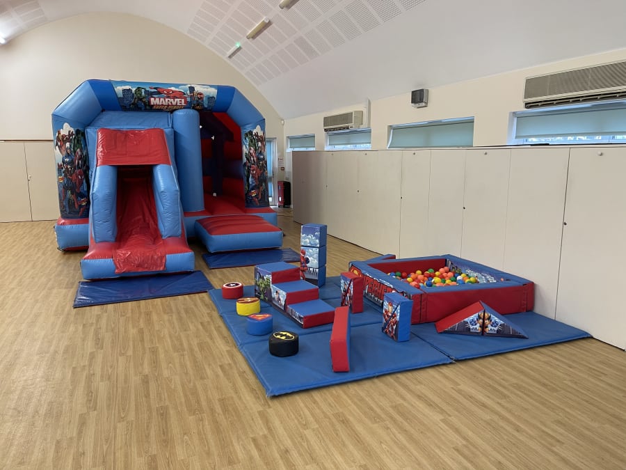 This is the main event when it comes to a superhero package. Not only do you get one of our iconic Disco Bounce and Slide castles you also get the 18 piece soft play which includes a ball pool and is all printed with your favourite superhero's!