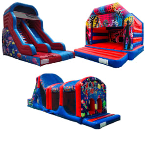 This package comprises of our 10' Mega drop Slide, 40' Assault course inc 10' Mega Drop Slide and a huge 15'x15' Disco Castle.