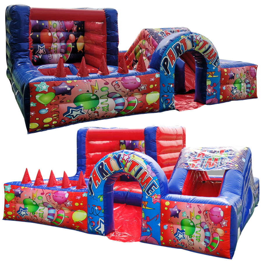 That's correct, you read it right the ultimate of party packages! So not only do you get a slide, a bouncy castle, air jugglers and an epic ball pool but you also get 18 pieces of Red and Blue glossy soft play that matches the play park perfectly!